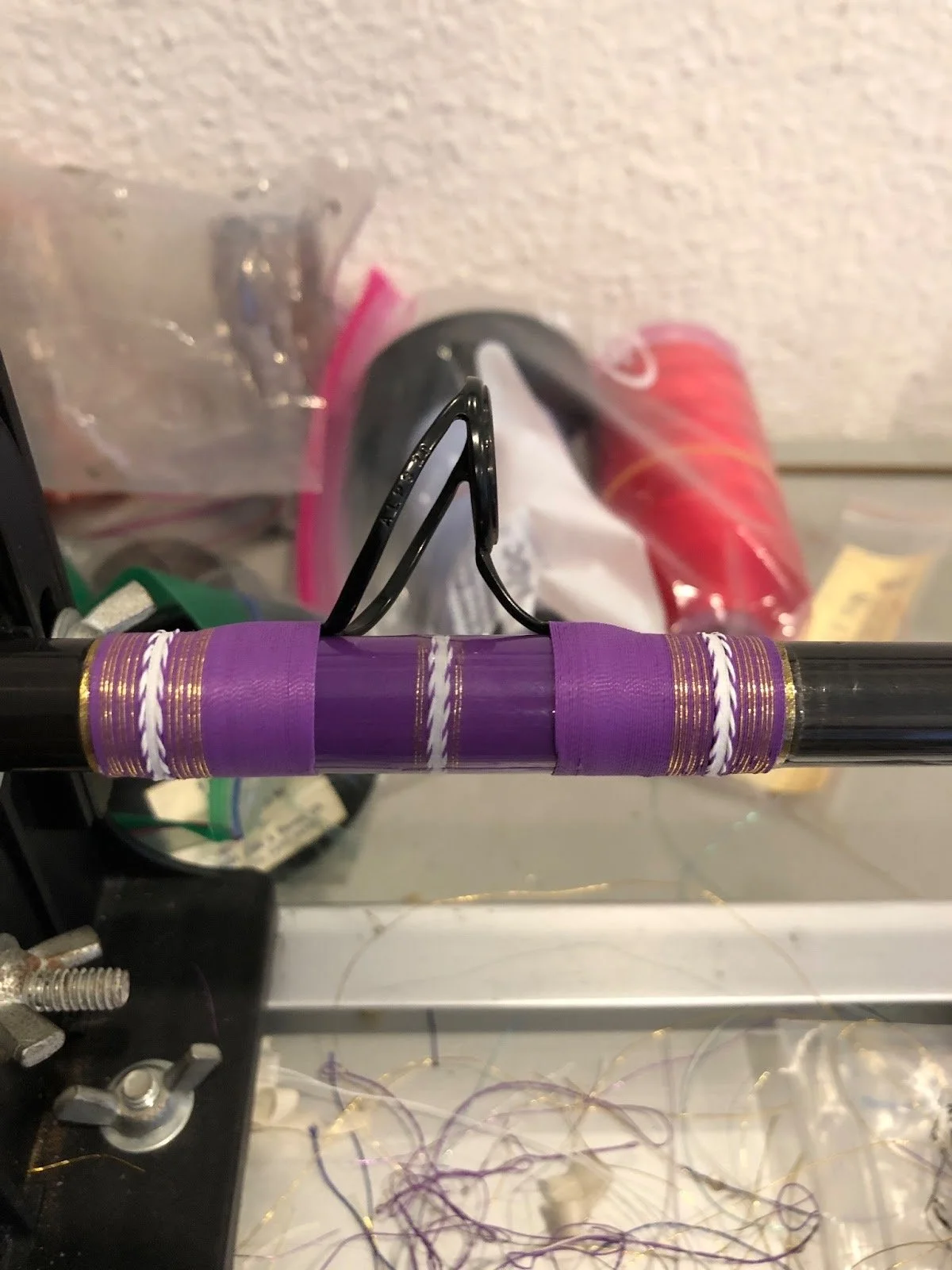 I began my first rod soon after joining. It was a Calstar 90j, a rare rod blank that Steve, a 92-year-old man with Parkinson's disease, had been generous enough to sell to me. With only three-hour meetings every two weeks at Don's house, progress on my rod was painstaking. The group showed me how to take a long, plain, conical blend of graphite and glass and transform it into a usable fishing tool. There are purely functional ways to wrap a rod. Thread secures each guide in place, creating a straight path for the fishing line to follow. But, the infinite number of patterns that can be created with that thread elevates the pursuit to an art form. The group taught me how to use a pedal-controlled lathe to manipulate the thread and bring tiger wraps, chevrons, and fades to life on my rods.