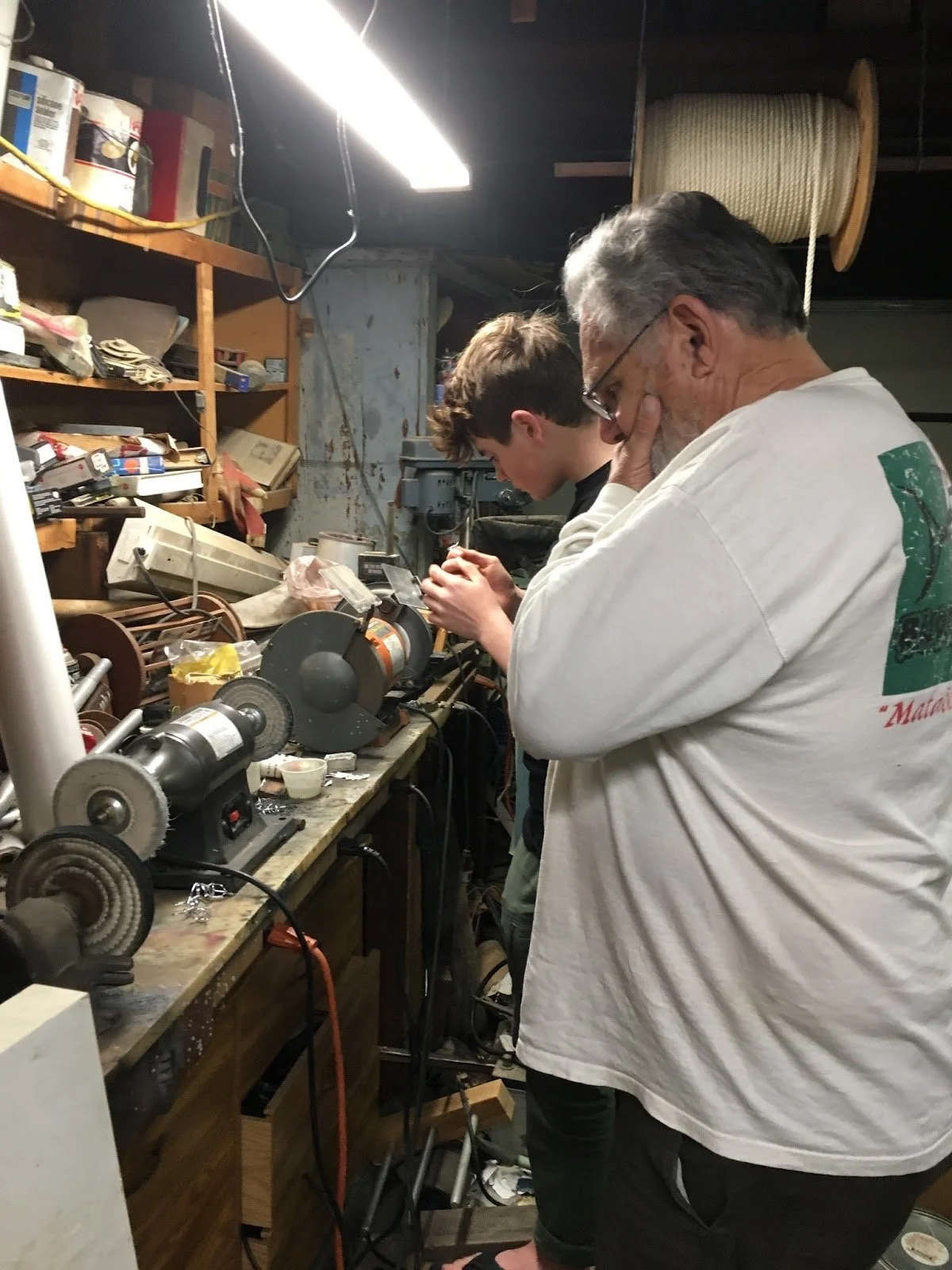 An image of my early days in rod building with Don. Here, I am grinding fishing guides down to an edge so that the thread can lay evenly on them.